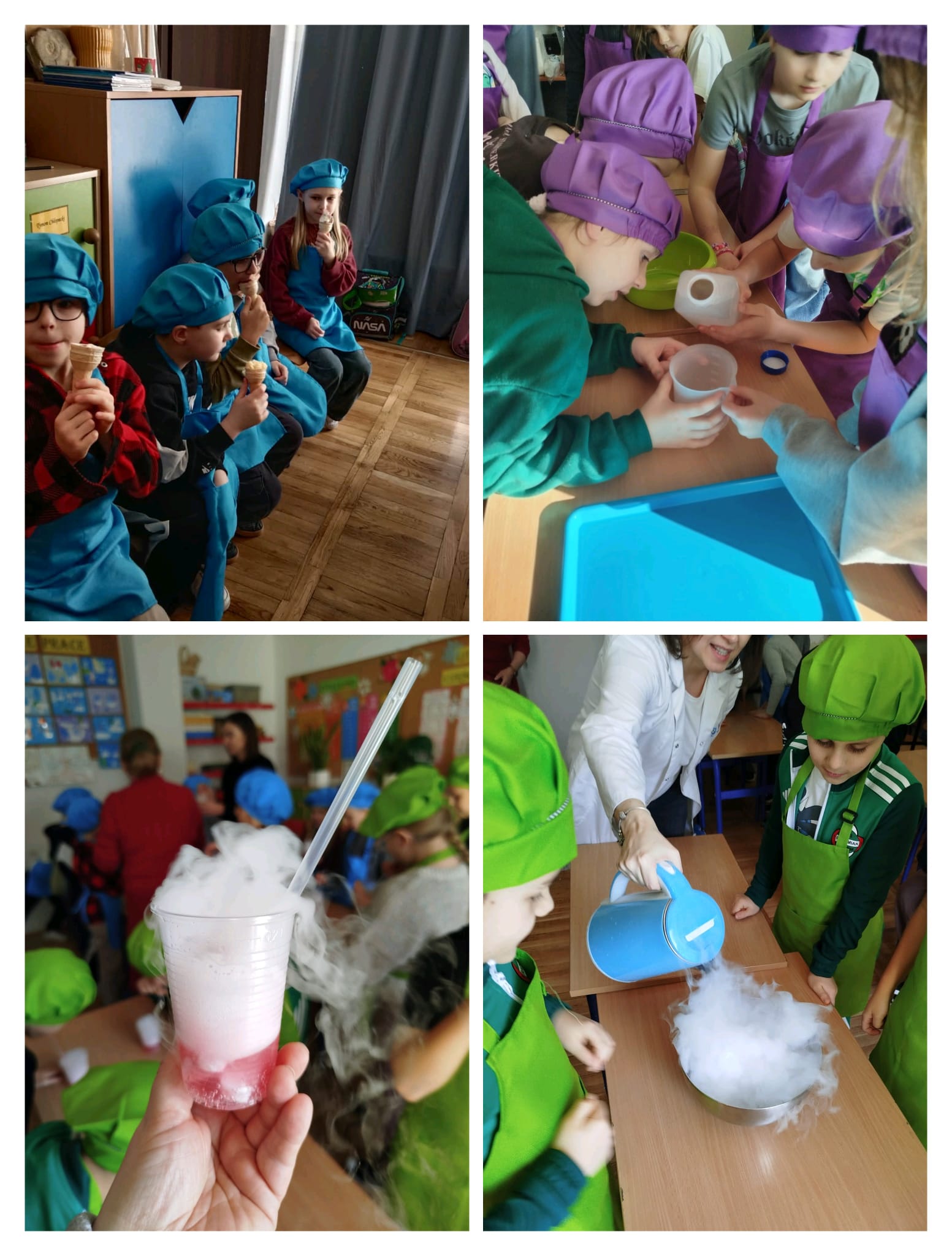 Część teoretyczna szybko ustąpiła miejsca praktyce. Wspólnie z prowadzącą uczniowie przygotowali trzy produkty spożywcze z wykorzystaniem suchego lodu. Pierwszym z nich był napój gazowany, który po dodaniu suchego lodu efektownie „dymił”, przypominając biały, parujący wulkan. Następnie powstały słodkie kulki wykorzystywane do popularnej herbaty bubble tea. Na zakończenie uczestnicy przygotowali lody, które powstały z połączenia zdrowych, owocowych smoothie z suchym lodem. Proces ich tworzenia był nie tylko ciekawy, ale również widowiskowy.